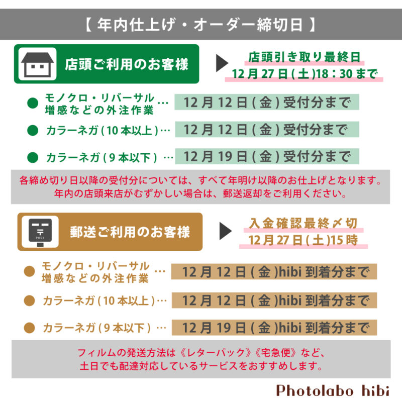 最終営業週は25日(木)・26日(金)・27日(土)の3日間オープンとなりますので、引き取りやフィルム購入などお忘れなく!