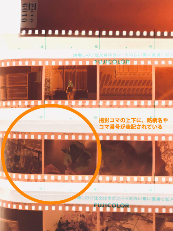 ▲ネガシートのオモテ面に指示マステを貼るので、事前に確認をします。ネガには表裏があり、オモテ面から見る写真が正しい向きです。ネガに印字されているメーカー名やコマ数字で判別できるので、表裏が逆になっていないか確認してください。