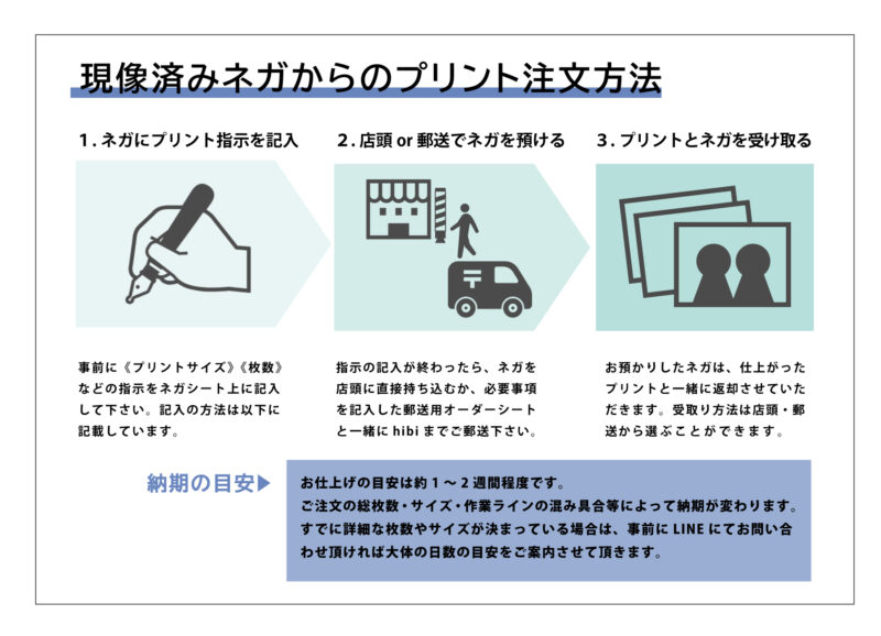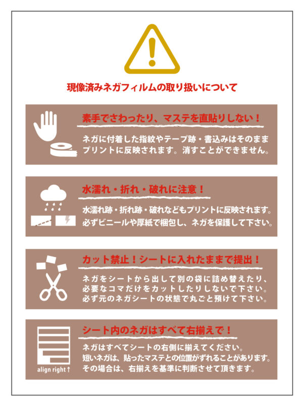 ※「マステを貼り忘れて注文枚数が足りなかった」「プリントしたいサイズと枚数が合っていなかった」というケースが増えています。後日、追加注文時にご希望の納期に添えない場合があるため、ネガ提出前に必ずお客様側で注文内容をご確認ください。