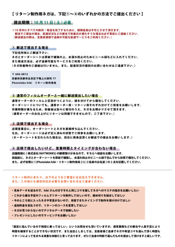 ②ネガの提出方法は、店頭・郵送のどちらかを選んで頂けます。詳細及び注意事項をご確認頂き、期日までに提出をお願いします。