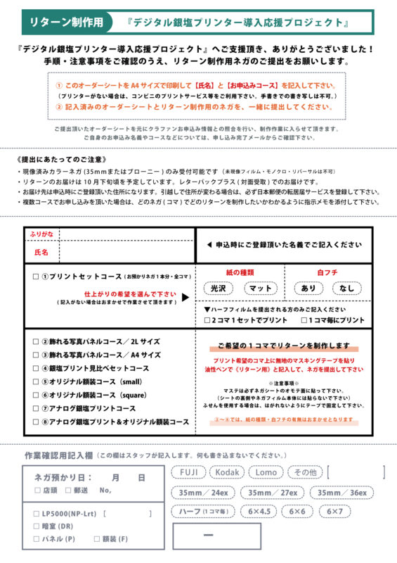 ①リターン制作用ネガの提出時、以下のオーダーシートの同封が必要です。